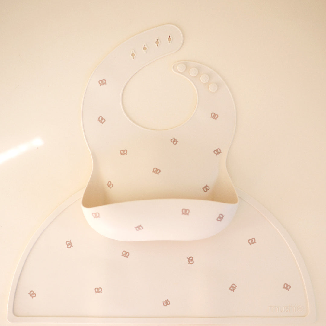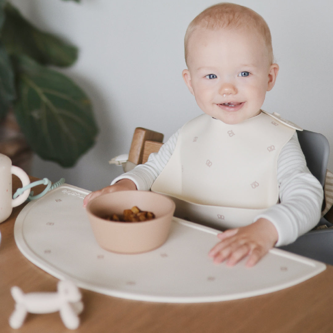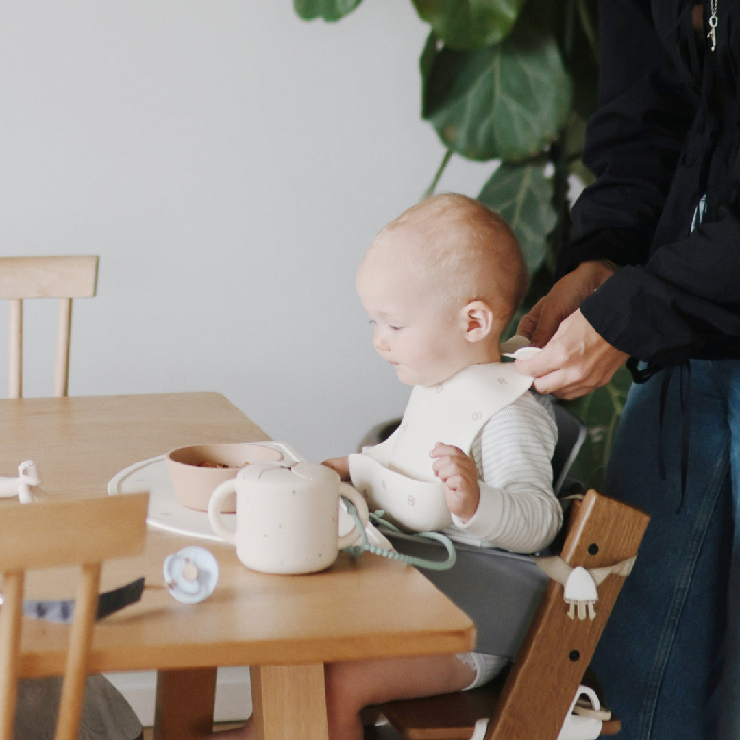 同じデザインや同じカラーのシリコンエプロン、プレート、スプーンで揃えるとmushie(ムシエ)のおしゃれなテーブルコーディネートができあがります。