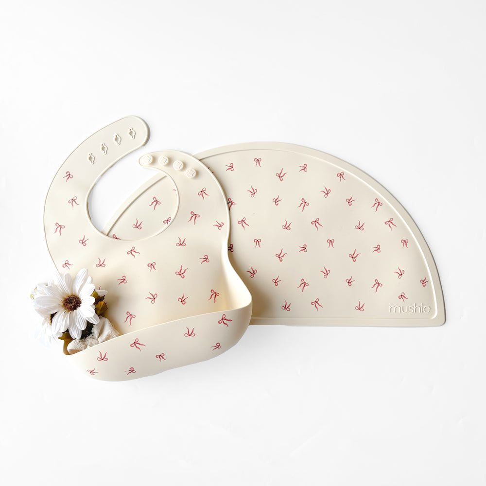 ありそうでなかったシリコンお食事エプロンと同じデザインのランチョンマットのギフトセット。