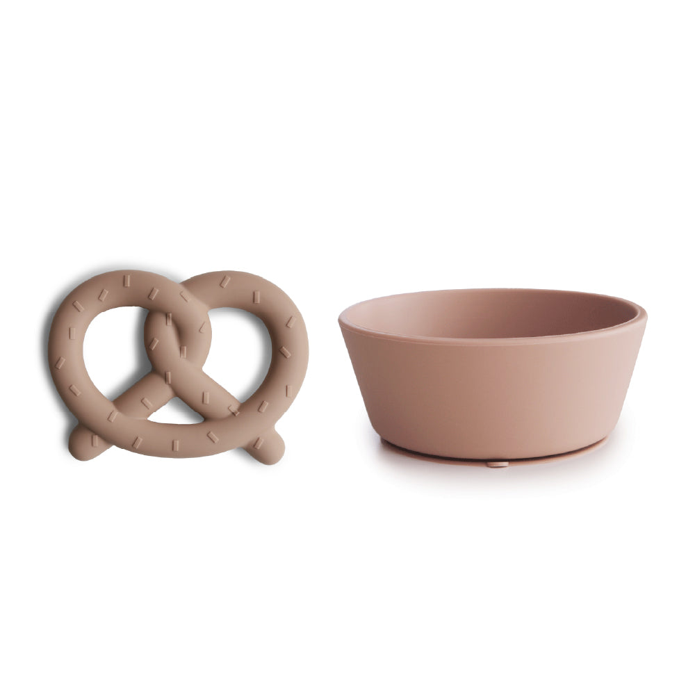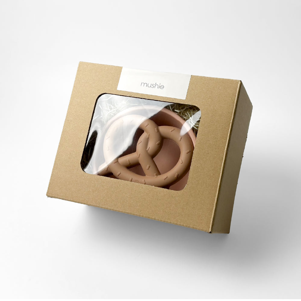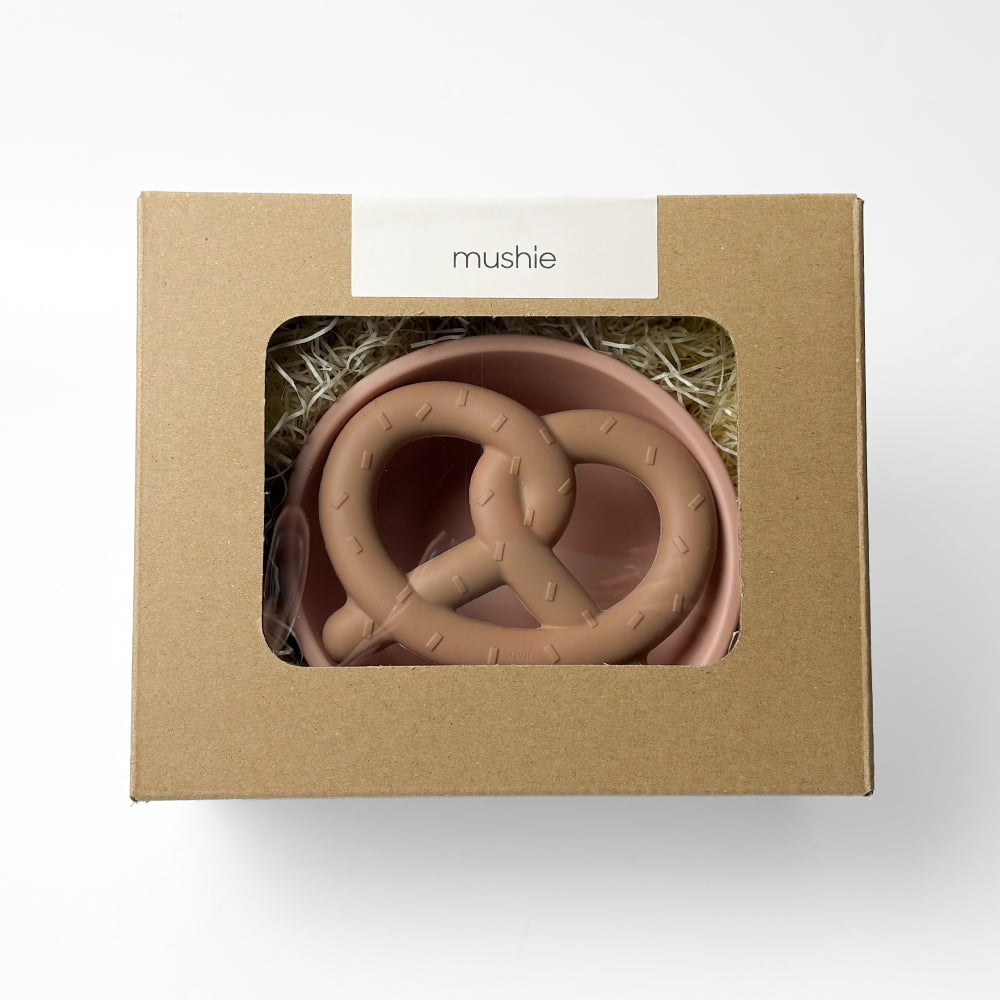 mushie(ムシエ)の間でいる姿が可愛いティーサー(歯固め)と吸盤付きでひっくり返りにくいシリコンボウル食器のギフトセット。オリジナルギフトボックスに詰め込んで可愛いギフトセットにしました。くすみカラーがかわいいと歯固めと便利なボウルのセットはおしゃれママにも喜ばれます。