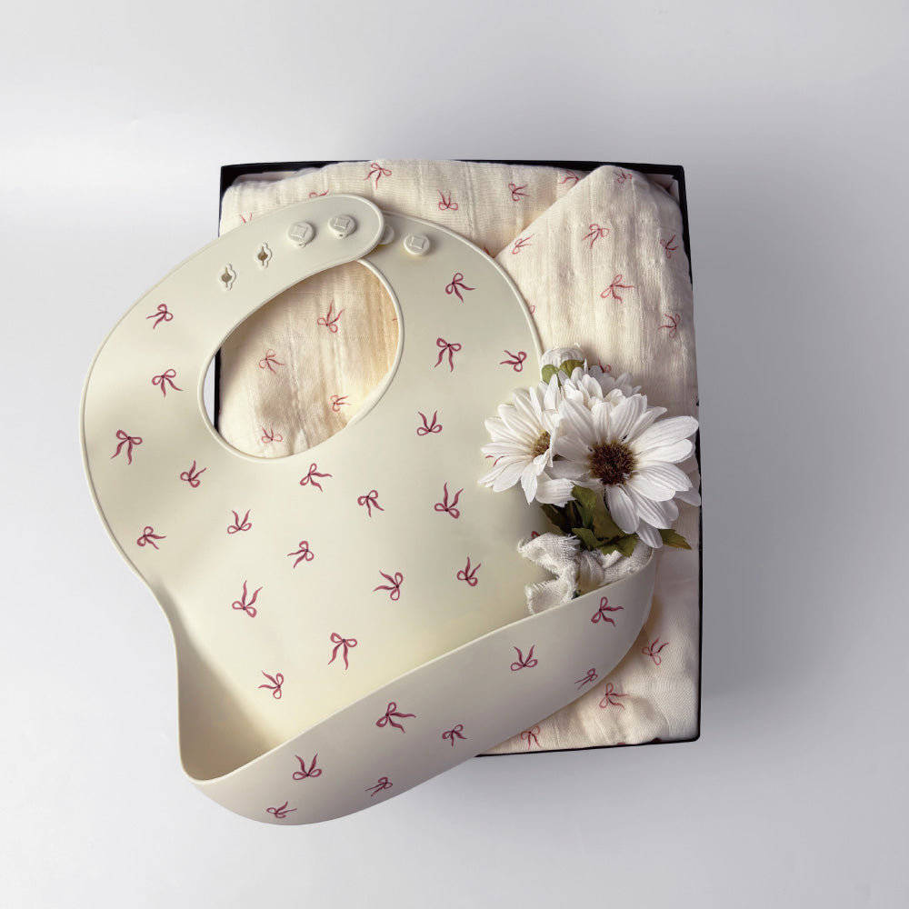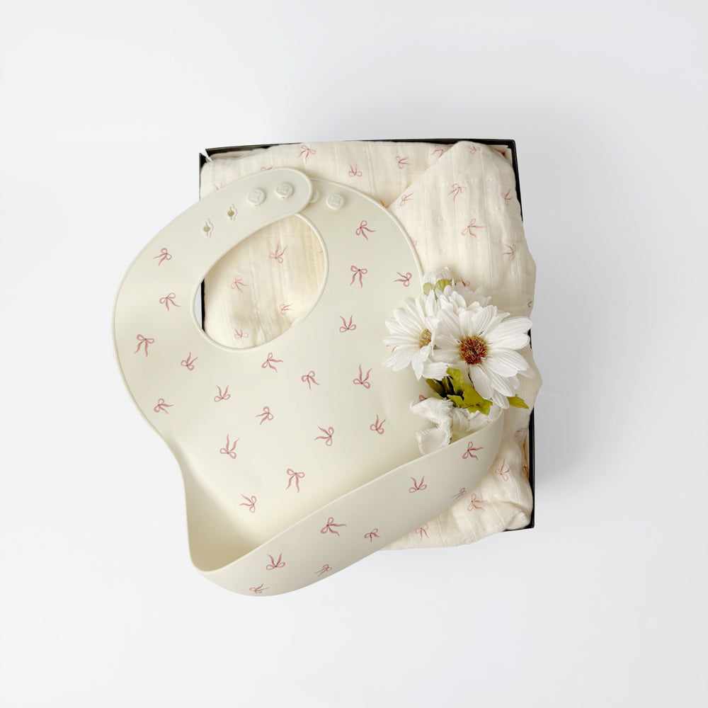 人気のお食事エプロン、オーガニックコットンのおくるみををギフトボックスに入れてミニブーケを添えてギフトセットにしました。