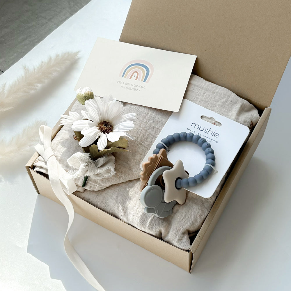 生まれてからすぐ使えるおくるみと、おしゃれなリング型ティーサー(歯固め)雰囲気を揃えたアイテムは見ているだけでも癒されます。クラフトボックスに入れてお届け。