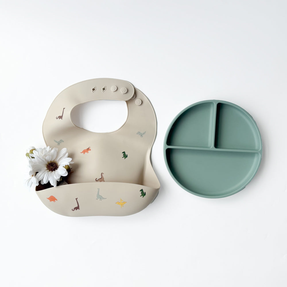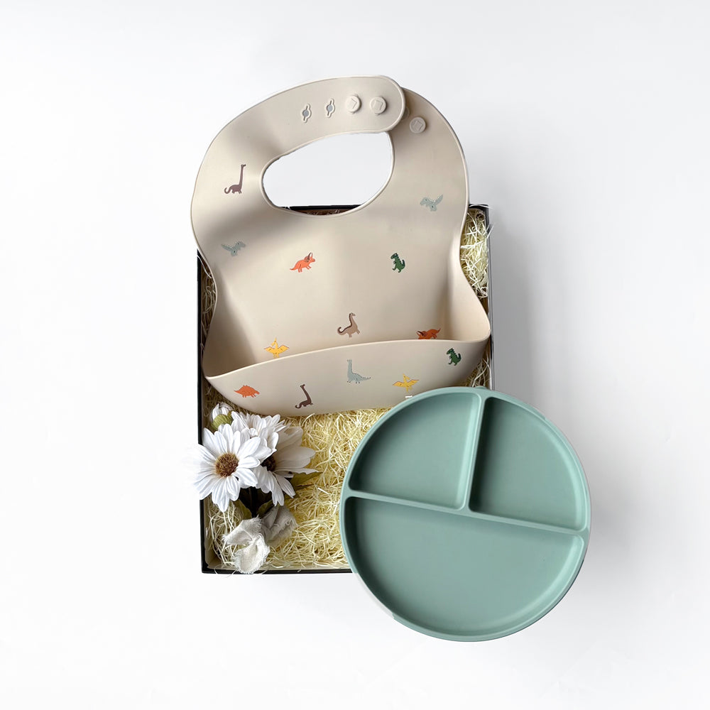 ありそうでなかったシリコンお食事エプロンとひっくり返りにくいプレートのギフトセット。