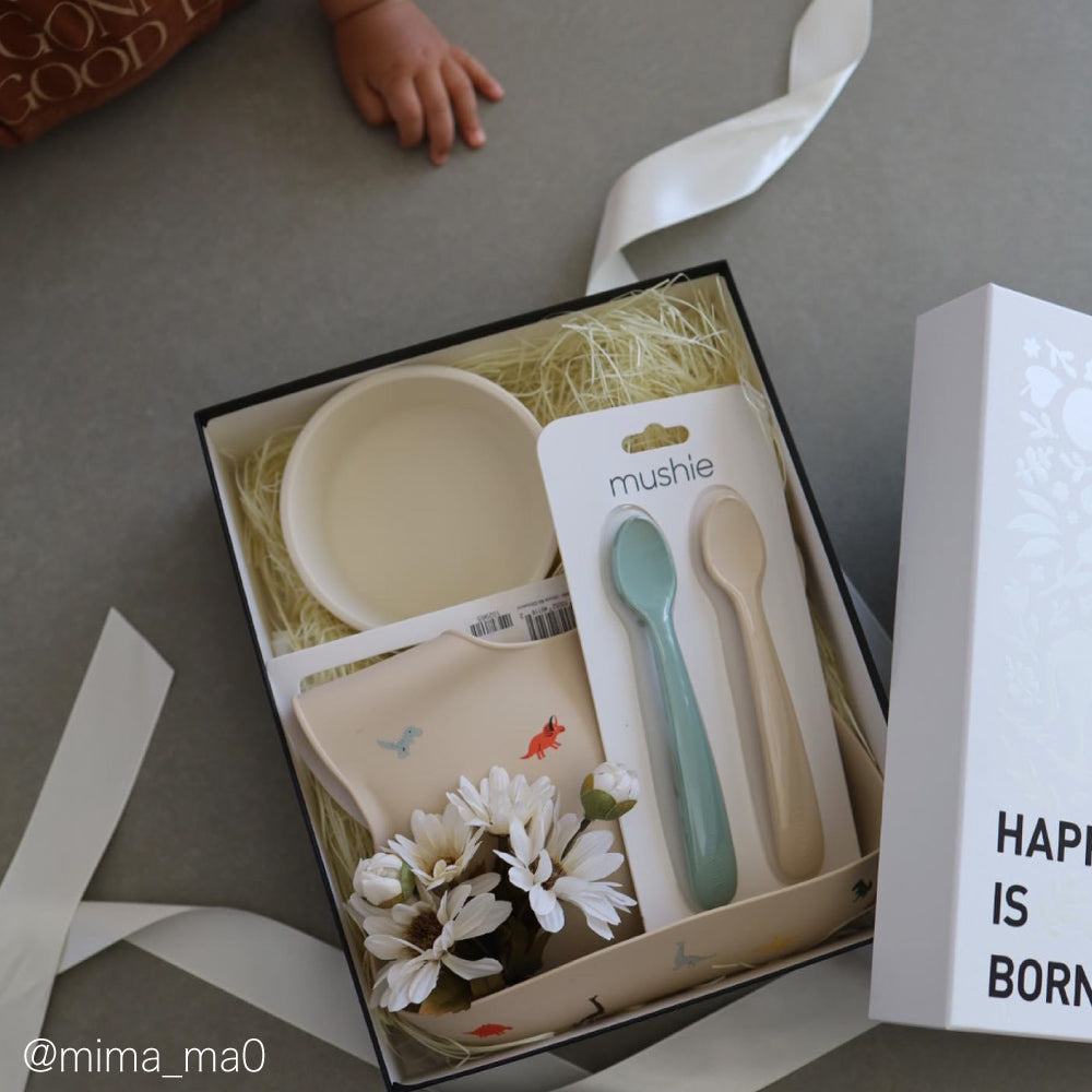 日々のお食事に最適な愛らしいデザインのお食事エプロン、吸盤付きのひっくり返らないボウルや口当たりの優しいスプーンセットをギフトボックスに入れてお届け。