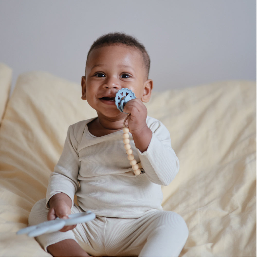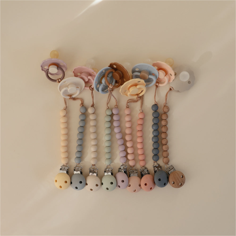 ビーズと木目デザインの留め具はシリコン製なので、より安心安全にお使いいただけます。