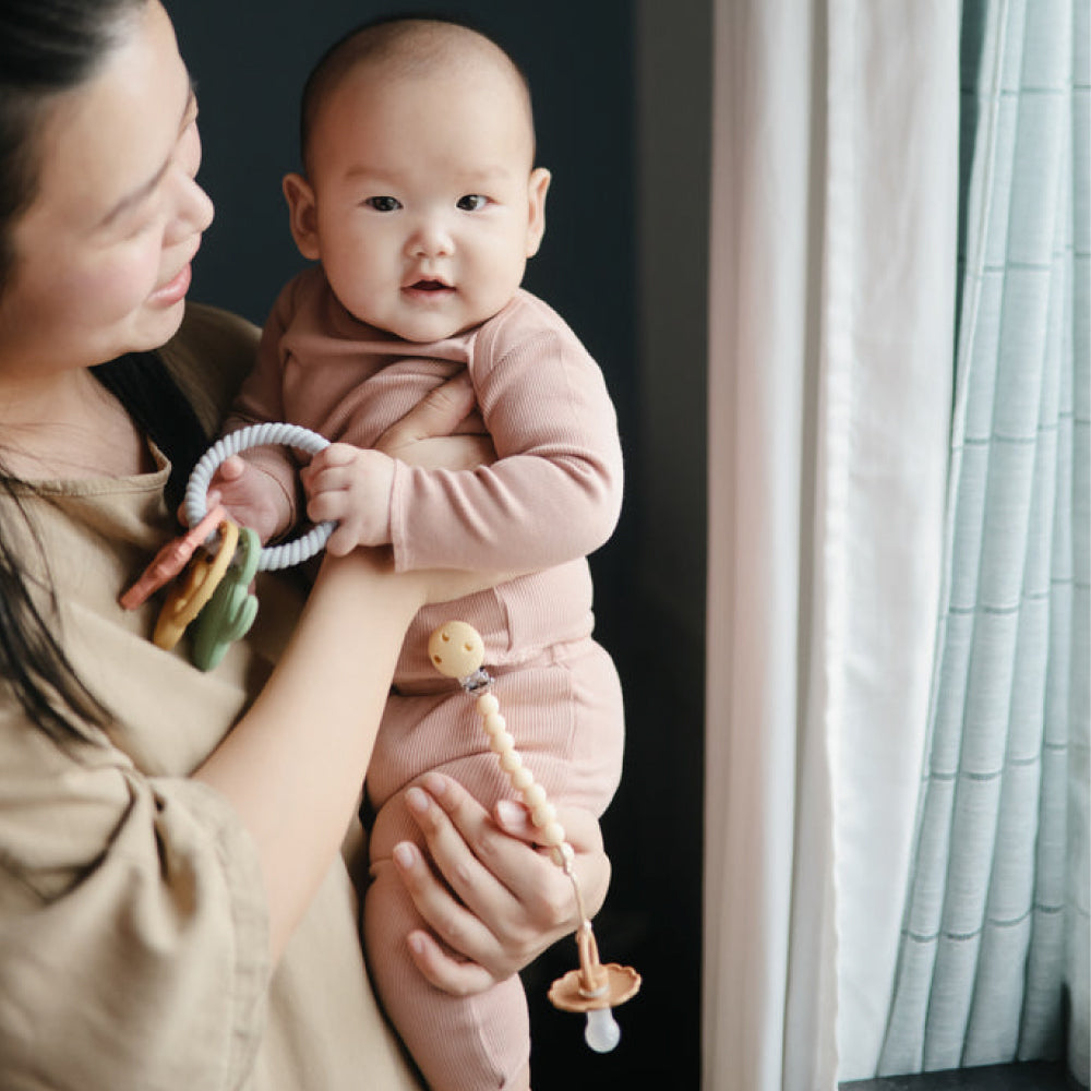 おしゃぶりの紛失や落下を防ぎ、おしゃぶりを安全に服に留めることができます。