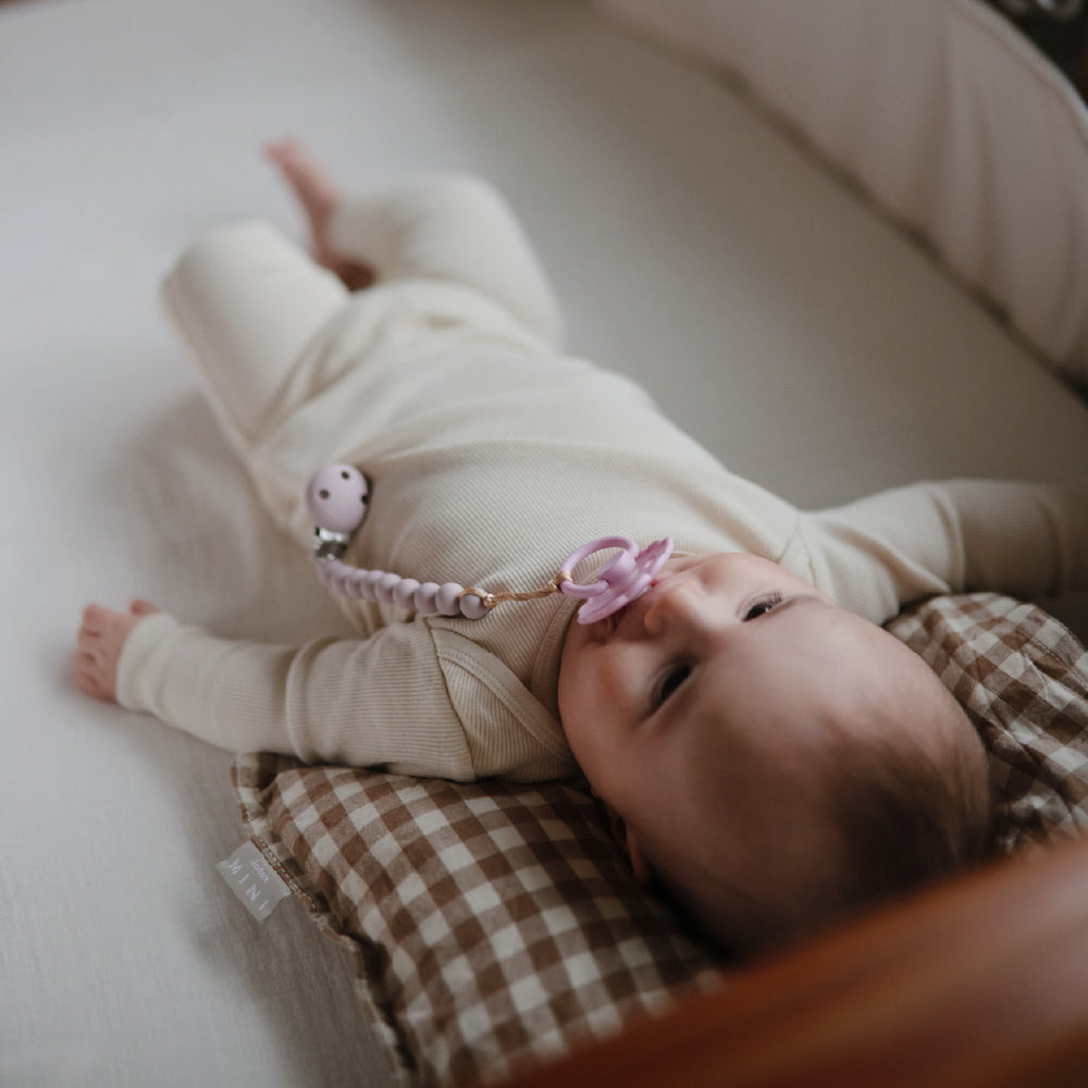おしゃぶりクリップは衣服にのみ取り付けることをお勧めします。