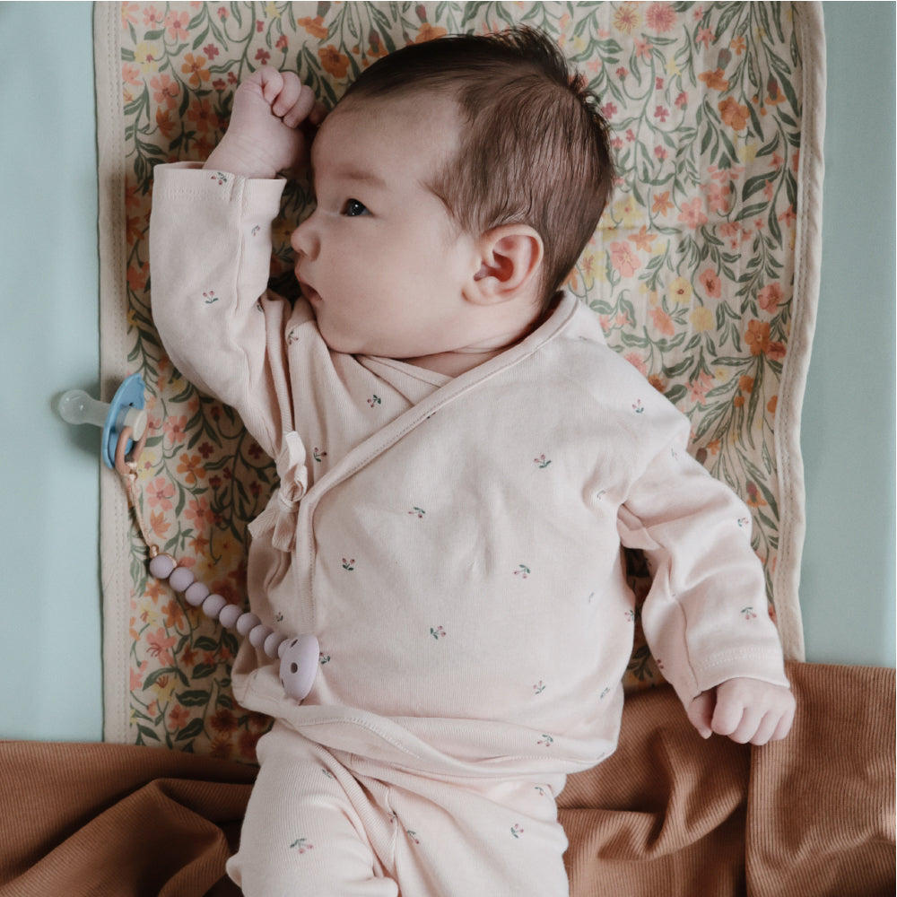 おしゃぶりの紛失や落下を防ぎ、おしゃぶりを安全に服に留めることができます。
